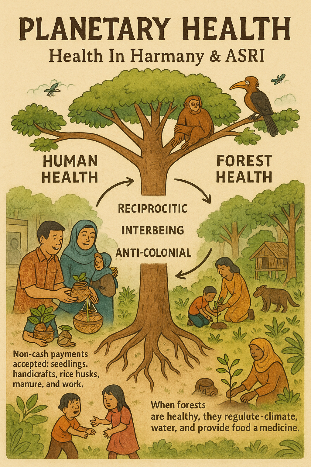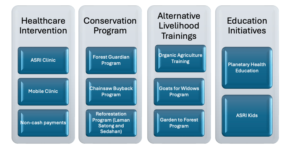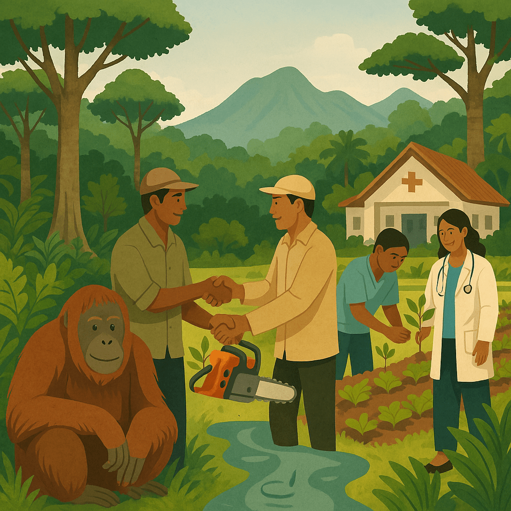 For decades, villagers living near Gunung Palung National Park in West Kalimantan faced the reality of a brutal tradeoff: to pay for healthcare, they logged trees illegally. The forest was their insurance policy—but every cut eroded the very ecosystem that once protected them. This wasn’t just a deforestation crisis. It was a planetary health crisis: the breakdown of the relationship between human health and ecological systems. Between 2007-2008 HIH and ASRI asked a radically different question—not what law enforcement is needed to protect the forest, but:
